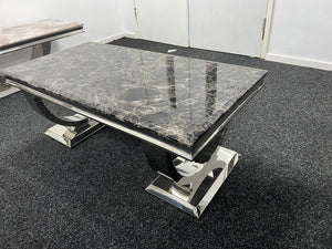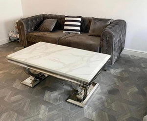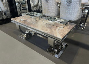 The Bravia marble coffee table is the epitome of style and glamour. With a unique marble top and a polished stainless steel double circular base, it is a perfect addition to any living space.