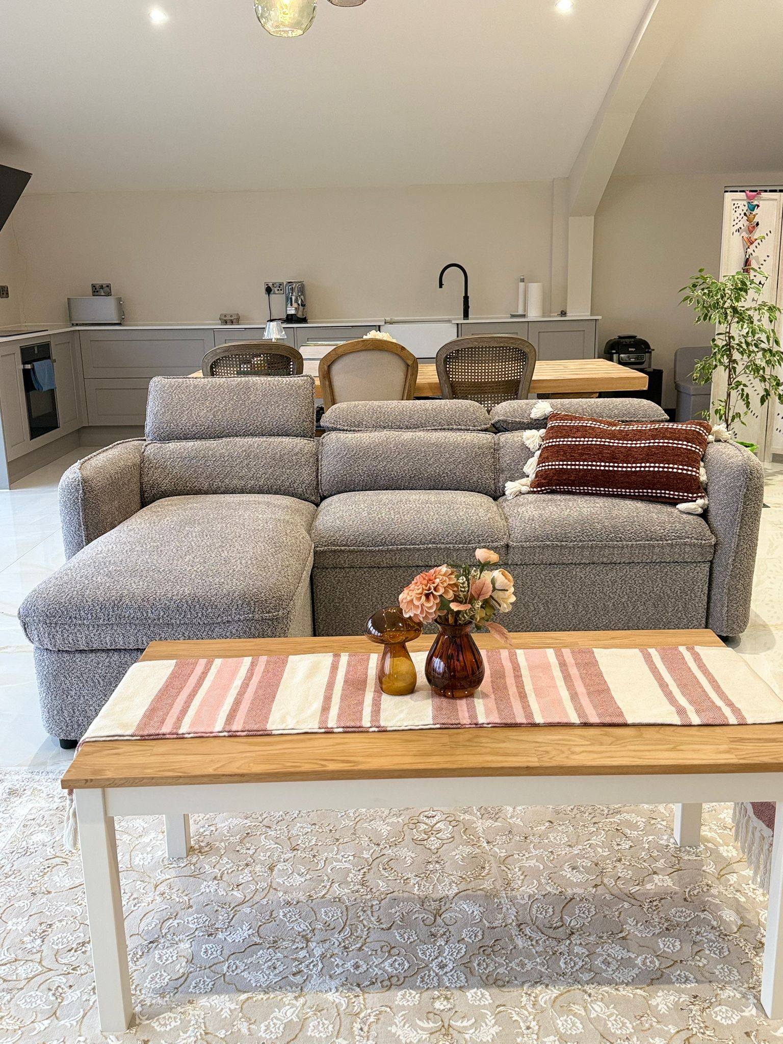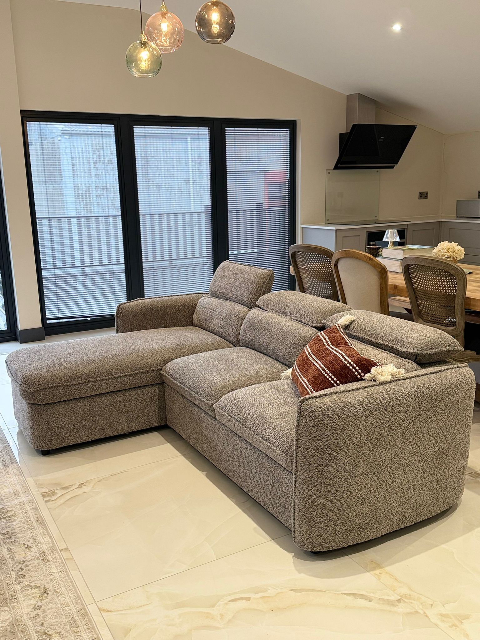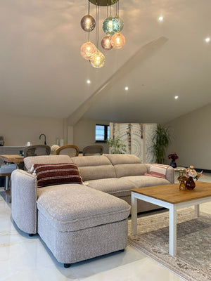 The L-shaped configuration maximises seating for 4-6 while the sturdy hardwood frame ensures daily durability and easy reconfiguration.