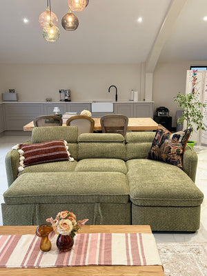 ✔ Capri L-shape corner sofa beds in Beige/Green/Grey/Blue for UK homes