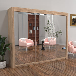 The Chicago three mirrored doors wardrobe measures 250cm and features MDF wood construction with full-length mirrored doors. This design enhances spatial perception while providing functional storage. The mirrors reflect light, potentially increasing the brightness of interior spaces, thus contributing to a more open and organized environment.