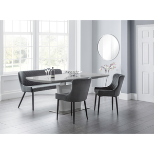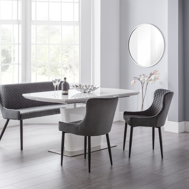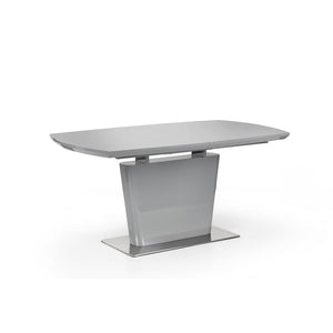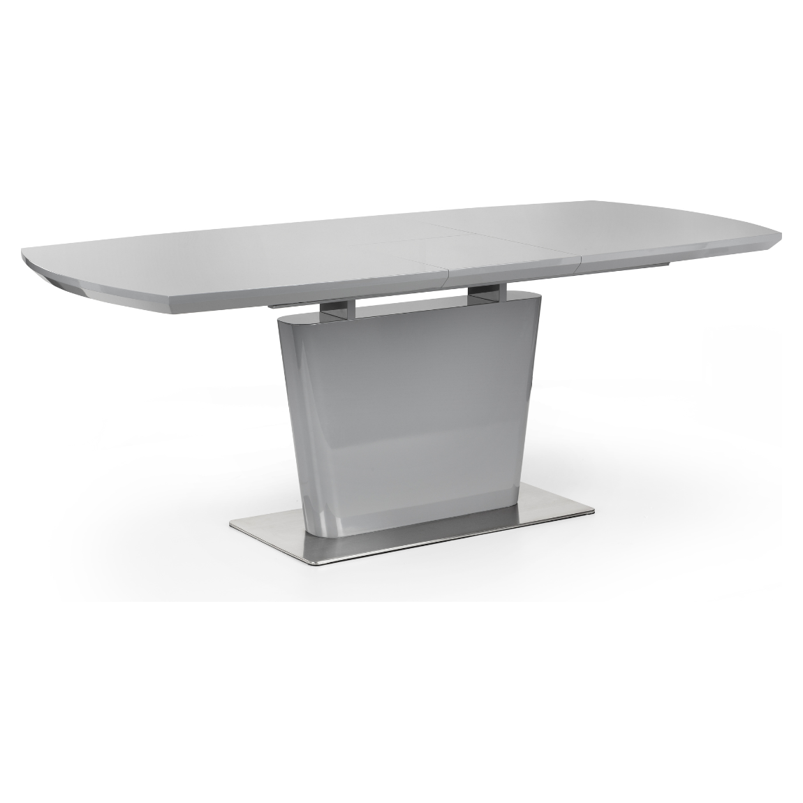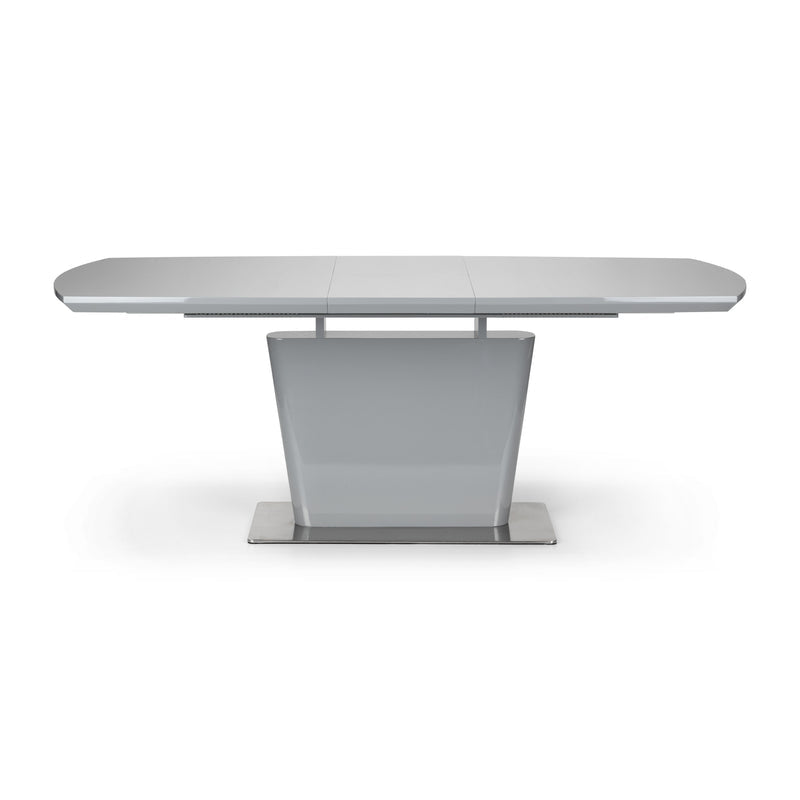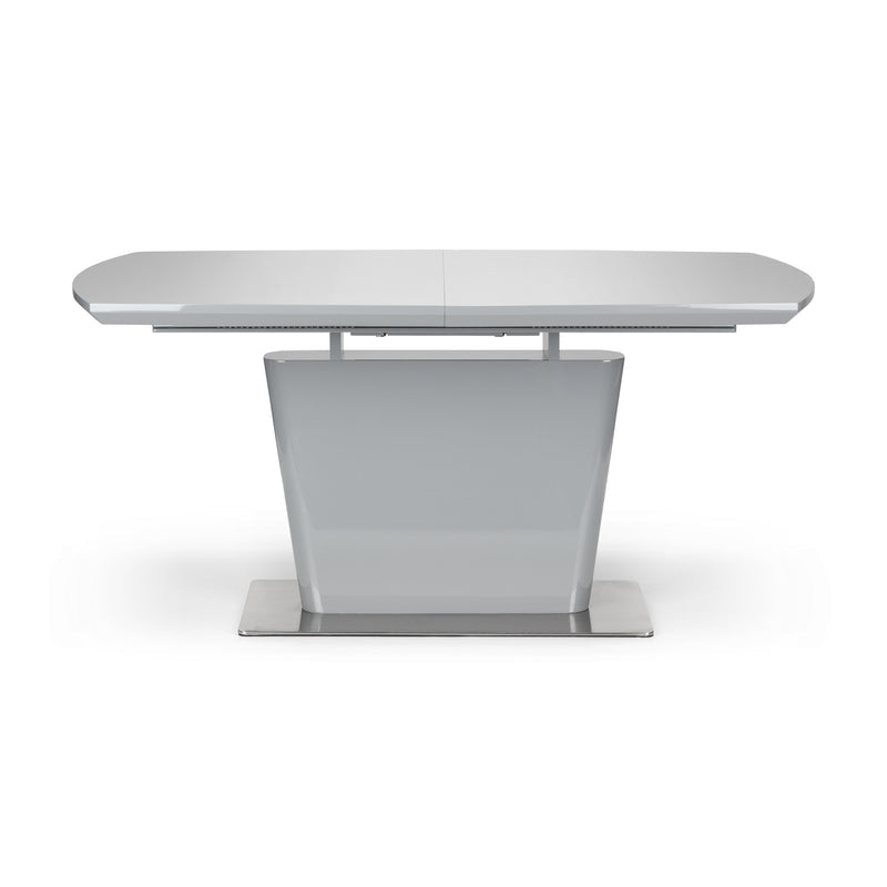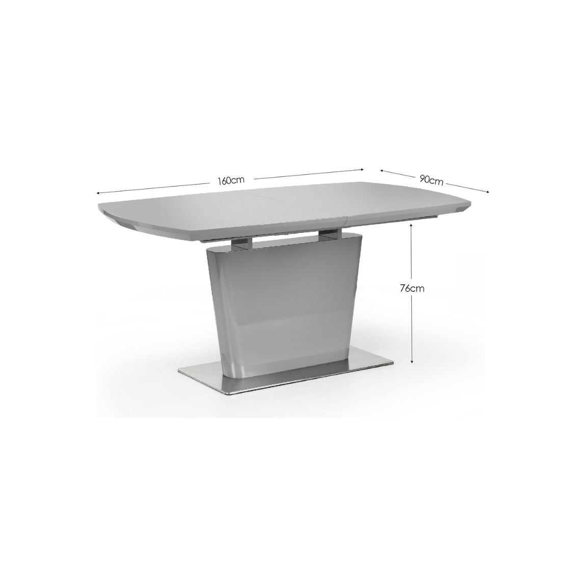 Upgrade your dining area with the Como High Gloss Extending Table in Grey. This modern centerpiece features a high-gloss finish and chrome pedestal base for a sleek look. With its butterfly extension system, it extends up to 200cm, perfect for family meals or entertaining guests. Plus, it comes with a 12-month guarantee for added peace of mind. Chairs sold separately.