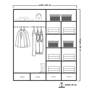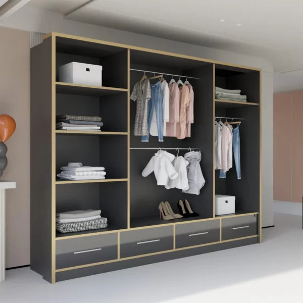 The Sydney high gloss wardrobe combines sophisticated design with practical storage across two versatile configurations. The compact 203cm model features two doors, four drawers, a single hanging rail, and ten shelves, ideal for smaller bedrooms. The expansive 253cm version offers three doors, four drawers, three hanging rails, and five shelves for comprehensive wardrobe organisation. Both stand 220cm tall with a 66cm depth, maximising vertical space without protruding into your room. Choose from striking Black & Gold, contemporary Grey & Gold, or classic White & Gold finishes to complement your interior aesthetic.