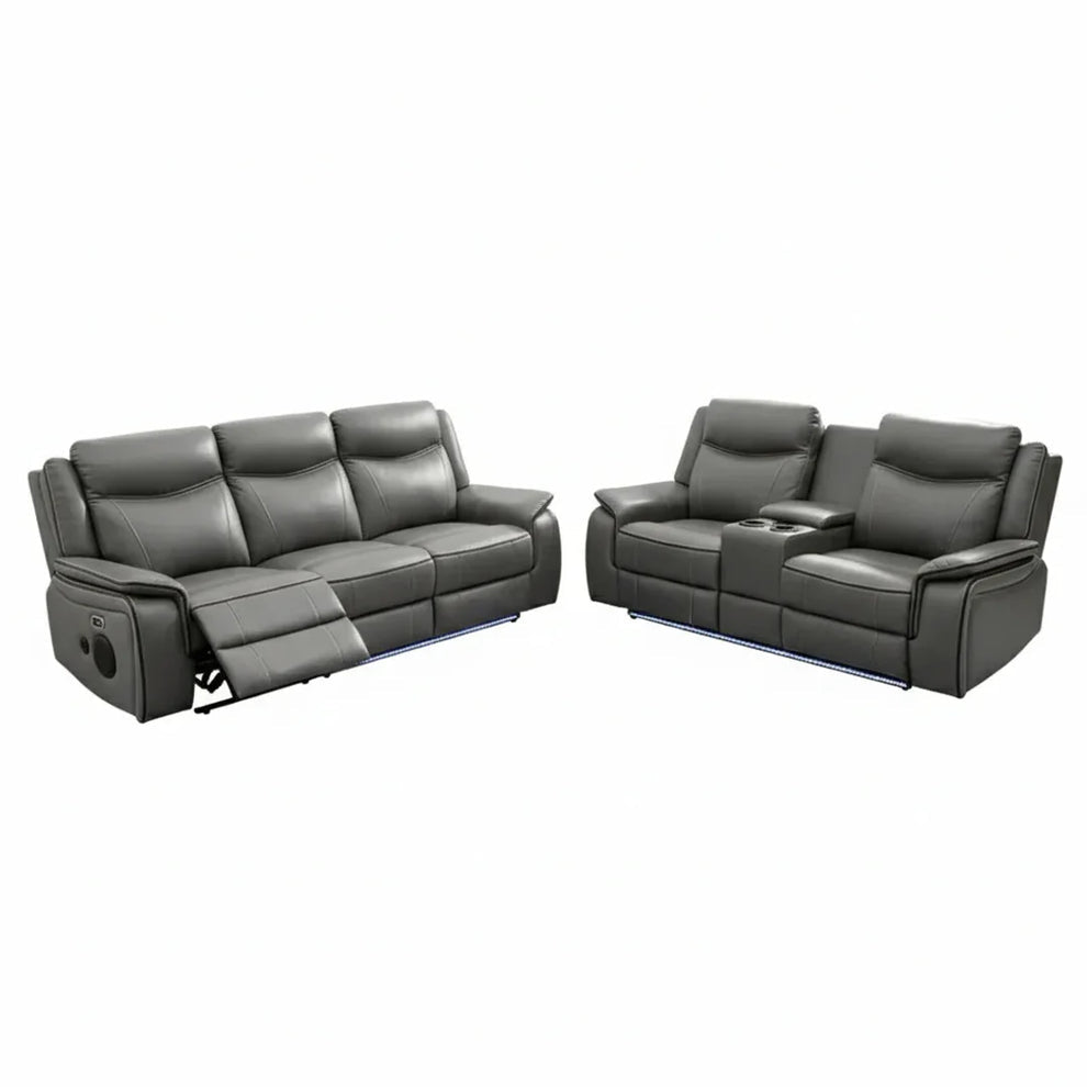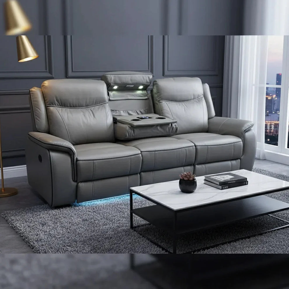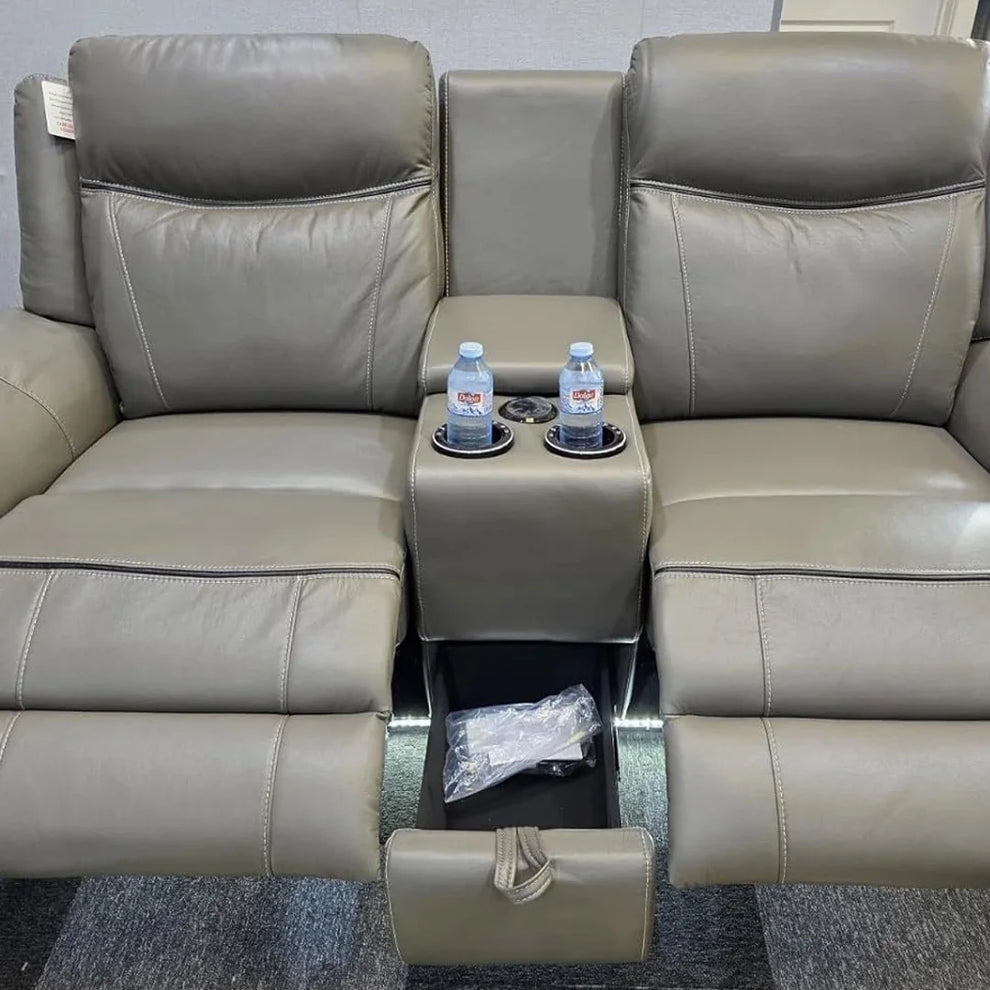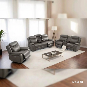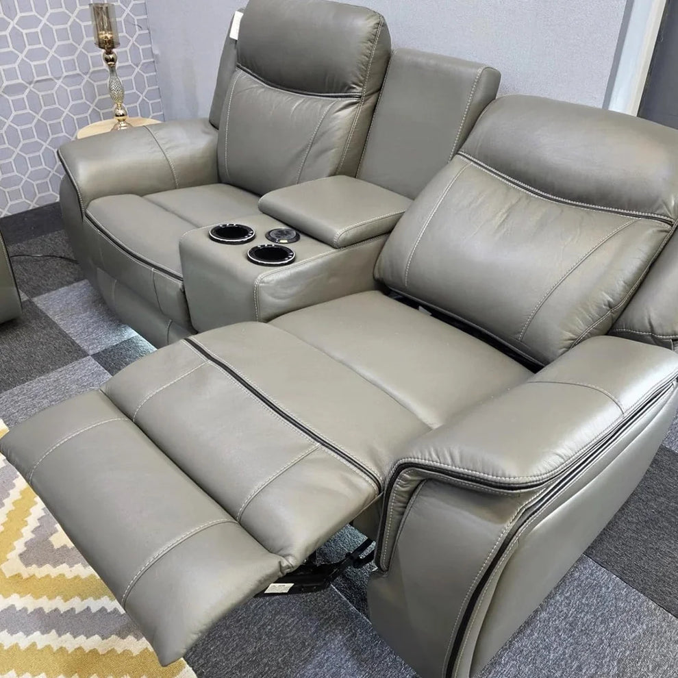 The PRADA Leather Suite integrates high-quality leather upholstery with modern technology to enhance your living space. With deep, supportive seating and smooth electric recliners, it prioritizes comfort. Essential features include integrated cooling cup holders, USB ports, and built-in Bluetooth speakers, all designed to create a relaxed, cinema-style atmosphere. Available in sophisticated grey hues.