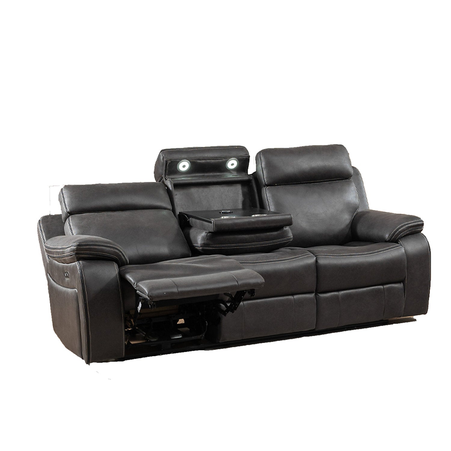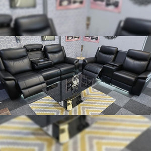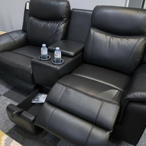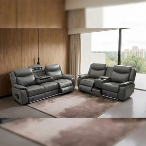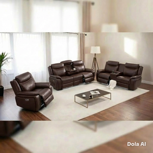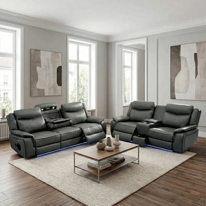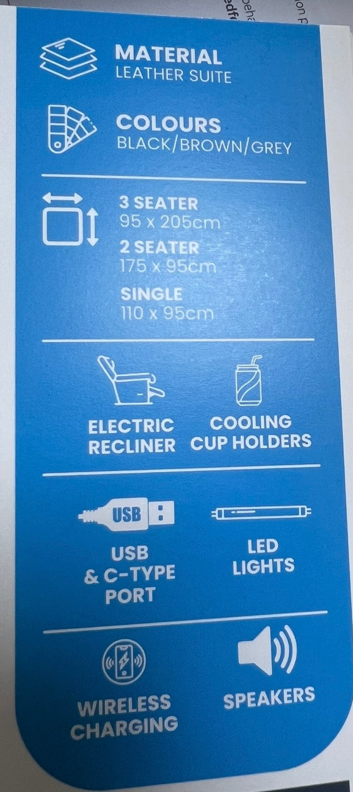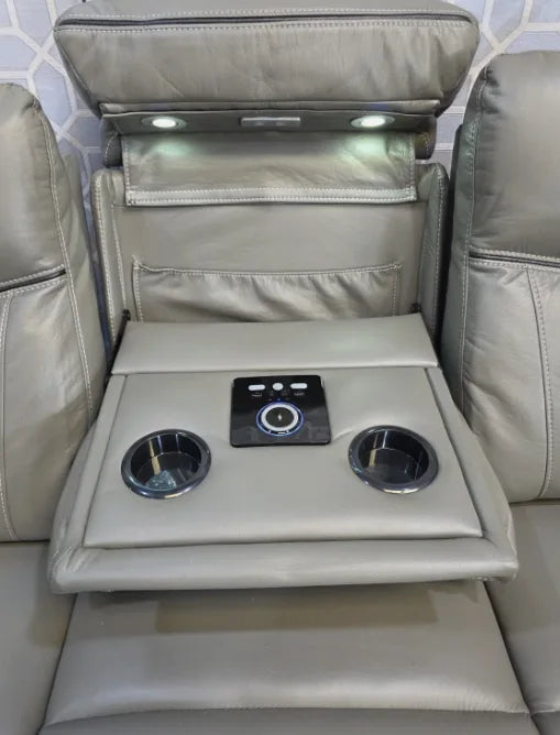 The PRADA Leather Suite integrates high-quality leather upholstery with modern technology to enhance your living space. With deep, supportive seating and smooth electric recliners, it prioritizes comfort. Essential features include integrated cooling cup holders, USB ports, and built-in Bluetooth speakers, all designed to create a relaxed, cinema-style atmosphere. Available in sophisticated grey hues.