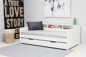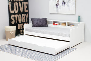 Tyler Guest Bed is seen as a sleeping area or a sofa this style gives you options. Made from solid pine the structure is going to bring stability and reliability though out the years. The white colour is modern and would effective in a fashionable bedroom setting . Tyler Guest Bed you get attention to detail, you can tell that time has been taken by the craftsman on this particular furniture piece. The underbed drawer is easily moved in and out using the castors on the under side. Add a low profile mattress this will help the bed stay user friendly and stabilise the fillings and springs.